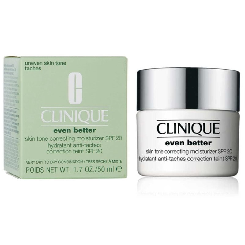 Clinique Even Better Skin Tone Correcting Moisturizer SPF 20 (50 ml) es una crema hidratante facial avanzada que ayuda a igualar el tono de la piel, reducir la apariencia de manchas oscuras y proteger el rostro contra los efectos dañinos del sol gracias a su filtro solar SPF 20.