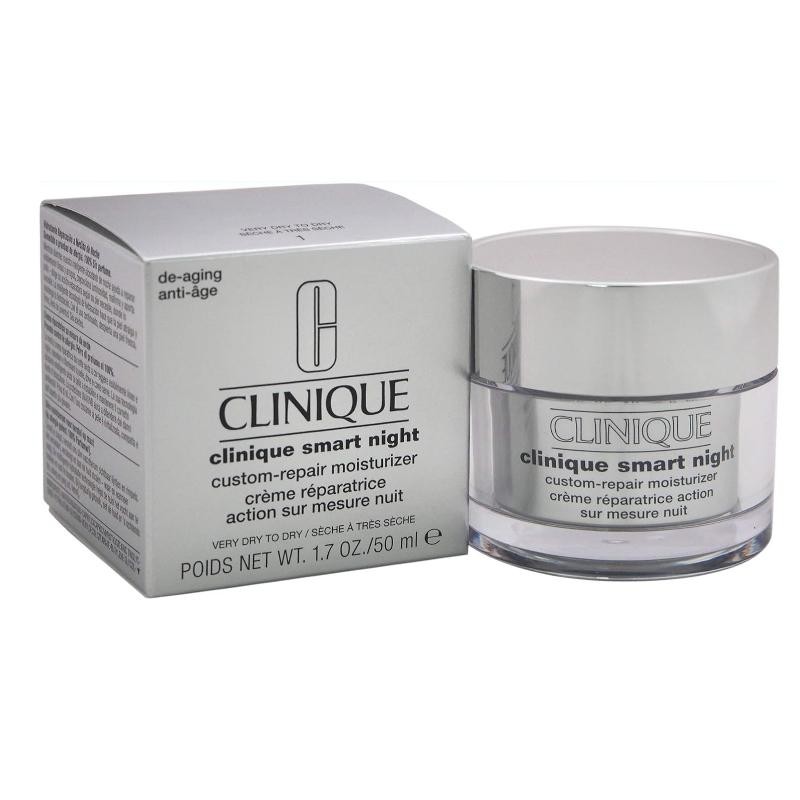 Clinique Smart Night Custom-Repair Moisturizer Very Dry to Dry es una crema de noche reparadora que hidrata intensamente, mejora la elasticidad y reduce arrugas. Ideal para piel muy seca a seca, ayuda a recuperar firmeza y luminosidad mientras duermes.