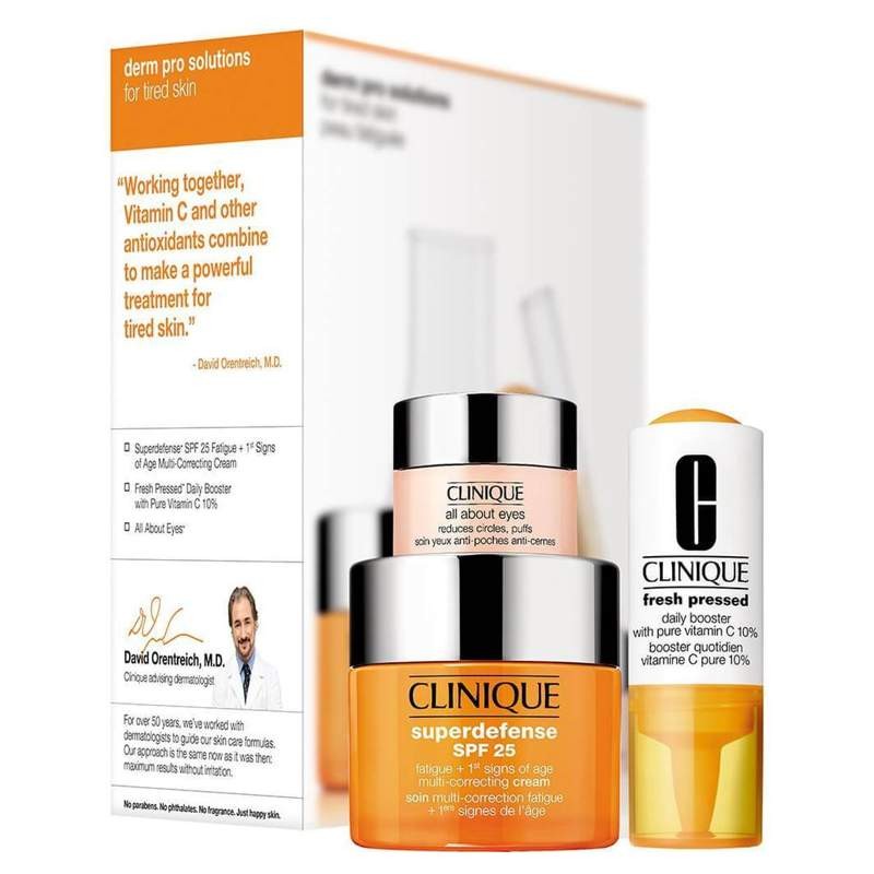 El estuche Clinique Superdefense incluye la crema Multi-Correcting Cream SPF 25 (50 ml), Fresh Pressed Daily Booster con vitamina C (8.5 ml) y All About Eyes (5 ml). Un ritual completo que hidrata, protege y corrige los primeros signos de la edad en piel mixta a grasa.