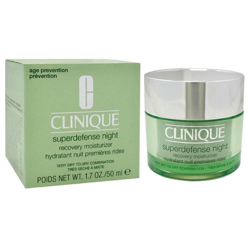 Clinique Superdefense Night Recovery Moisturizer Very Dry to Dry Combination es una crema de noche diseñada para revitalizar y reparar la piel mientras duermes. Formulada con antioxidantes y agentes hidratantes, combate los radicales libres y los primeros signos de envejecimiento. Su textura rica y nutritiva aporta confort inmediato, refuerza la barrera natural de la piel y mejora su resistencia frente a las agresiones externas. Ideal para piel muy seca a mixta-seca, deja el rostro más terso, suave y radiante cada mañana.