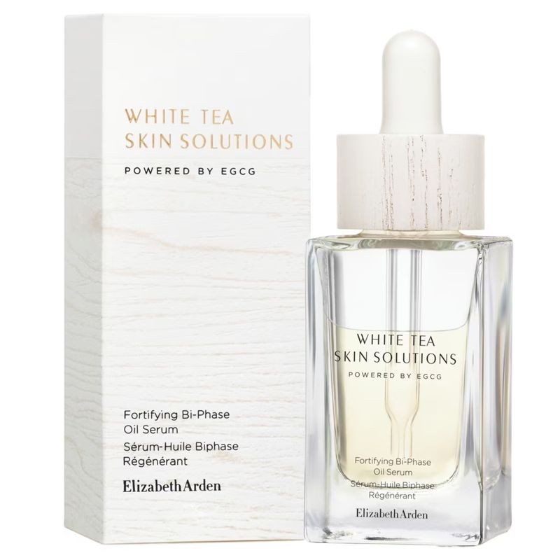 Elizabeth Arden White Tea Skin Solutions Fortifying Bi-Phase Oil Serum 30 ml combina una fase acuosa calmante con aceites nutritivos para fortalecer, hidratar y suavizar la piel. Enriquecido con té blanco y antioxidantes, mejora la barrera cutánea, aporta luminosidad y reduce la sensibilidad. De rápida absorción, deja el rostro radiante, equilibrado y más resistente.